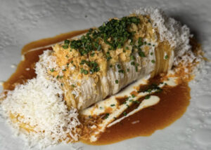 Από τα πιάτα που έχουν ταυτιστεί με τον Καραθάνο από την πρώτη ημέρα του Ateno, η ελληνική σαλάτα του έχει εξελιχθεί σε κάτι περισσότερο από υπογραφή. Σε συγκινεί ακριβώς γιατί σου θυμίζει κάτι βαθιά οικείο και το κάνει με καθαρότητα. Τα «εικονικά» γεμιστά κουβαλούν τη δική τους ιστορία από τα χρόνια της Hytra και εδώ εμφανίζονται πιο εξελιγμένα. Τζελ από νερό ντομάτας, πιπεριές του μπακάλη και κρέμα φέτας. Η γεύση των γεμιστών αποδίδεται με εντυπωσιακή ακρίβεια, με συμπύκνωση και ένταση, σαν να κρατάς το ελληνικό καλοκαίρι σε μια κουταλιά. Η τσιπούρα με βιολογικό κριθαράκι, μάραθο και αυγοτάραχο Τρικαλινού παραμένει ένα από τα πιο σταθερά και αγαπημένα πιάτα.