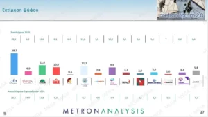 Η Metron Analysis προβλέπει εννιακομματική Βουλή με τη Νέα Δημοκρατία στο 28,7% και το ΠΑΣΟΚ στο 12,8%. Ακολουθούν η Ελληνική Λύση (11,7%), ΚΚΕ (10%), Πλεύση Ελευθερίας (9,9%), ΣΥΡΙΖΑ (4,9%), Φωνή Λογικής (3,6%), Κίνημα Δημοκρατίας (3,2%), ΜέΡΑ25 (3,1%), Νίκη (2,8%), Νέα Αριστερά (2%), ΑΝΤΑΡΣΥΑ (1%) και Σπαρτιάτες (0,5%).