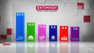 Η Marc παρουσιάζει τη ΝΔ να ξεπερνά το 30% φτάνοντας στο 30,5%, με το ΠΑΣΟΚ στο 14%. Ακολουθούν Πλεύση Ελευθερίας (10,8%), Ελληνική Λύση (9,5%), ΚΚΕ (8,4%), ΣΥΡΙΖΑ (7%), Φωνή Λογικής (3,8%), ΜέΡΑ25 (3,2%), Κίνημα Δημοκρατίας (2,6%), Νίκη (2,5%), Σπαρτιάτες (1,7%) και Νέα Αριστερά (1%).