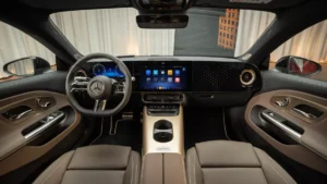 Στο εσωτερικό η σχεδίαση είναι μινιμαλιστική, με έμφαση σε τρία high-tech στοιχεία: την προαιρετική «αιωρούμενη» MBUX Superscreen που εκτείνεται σε όλο το πλάτος του ταμπλό, την ψηλά τοποθετημένη κεντρική κονσόλα και τα μεγάλα πάνελ στις πόρτες. Πίσω από μία ενιαία γυάλινη επιφάνεια κρύβονται ο ψηφιακός πίνακας οργάνων των 10,25 ιντσών, η κεντρική οθόνη του συστήματος infotainment των 14,0 ιντσών και –προαιρετικά– η οθόνη συνοδηγού των επίσης 14,0 ιντσών, με γραφικά σε πραγματικό χρόνο από την Unity Game Engine και πλήρη συνδεσιμότητα. Καρδιά της ψηφιακής εμπειρίας αποτελεί το νέο λειτουργικό σύστημα MB.OS, που έχει αναπτυχθεί εσωτερικά από τη Mercedes-Benz και υποστηρίζει over-the-air αναβαθμίσεις για σχεδόν όλα τα υποσυστήματα, ακόμη και τα συστήματα υποβοήθησης οδήγησης.