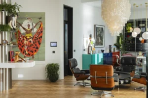 Τέσσερις εμβληματικές και κλασικές «Lounge Chairs», των Charles και Ray Eames για τον οίκο Vitra, συγκεντρώνονται γύρω από το coffee table Detour τoυ οίκου Gebrüder Thonet Vienna, κάτω από τον εμβληματικό πολυέλαιο «FUN 8DM» του Verner Panton, δημιουργώντας έναν ντιζάιν θύλακα χαλάρωσης μέσα στην κατοικία. Το ξύλινο δάπεδο ενισχύει τη ζεστασιά της σύνθεσης. Τα έπιπλα και ο φωτισμός παίζουν κεντρικό ρόλο τόσο στη δημιουργία ατμόσφαιρας όσο και στο εκλεκτικό στιλ αυτού του διαμερίσματος.