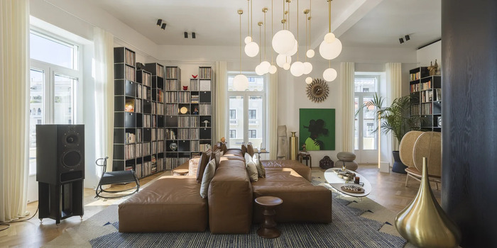 Το εργονομικό σύστημα αποθηκευτικών επίπλων USM Haller διατρέχει το διαμέρισμα και χρησιμοποιείται κυρίως για την οργάνωση της εκτεταμένης συλλογής βινυλίου και βιβλίων του ιδιοκτήτη. Τα ανοιχτά ράφια της σύνθεσης φιλοξενούν μινιατούρες των οίκων Vitra και Fritz Hansen, συλλεκτικά αντικείμενα, καθώς και design φωτιστικά που είναι σχεδιασμένα σαν γλυπτά από σημαντικούς σχεδιαστές όπως ο Michael Anastassiades και ο Tom Dixon, αλλά και οίκους όπως ο &Tradition και ο DCW Editions. Όσο για τη μοκέτα, δημιουργία του οίκου CC Tapis, είναι ειδική παραγγελία για το διαμέρισμα Grandeur.